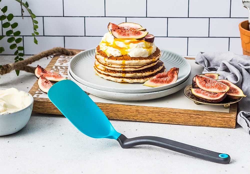 Its unique head lets you chop food right in the pan while keeping your hand safely away from heat. The flexible edge slides cleanly under delicate foods, while the curved design reaches into corners other spatulas miss. When you set it down, the bent handle keeps the head lifted off the counter for a cleaner, more hygienic workspace.