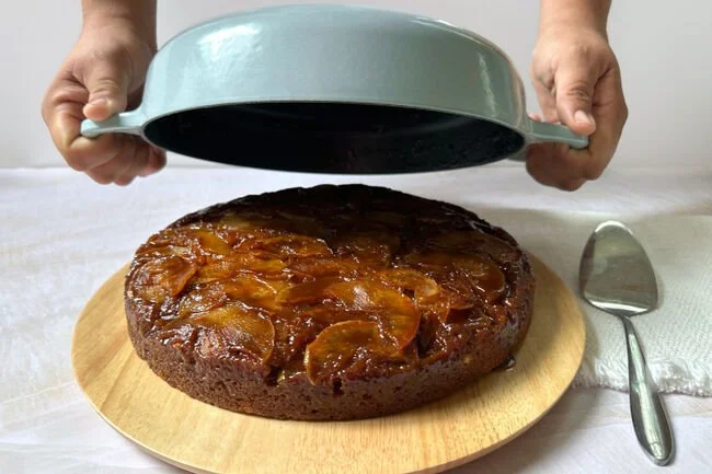 “Inspired by the classic French dessert, Tarte Tatin, this cake recipe from our partner Dan Pelosi (@grossypelosi) has a layer of apples nestled in a rich caramel sauce on the bottom of the pan. Instead of pastry, the caramel apples are topped with an easy one-bowl cake recipe. Bring the warm cake right to the table in the Signature Everyday Pan and flip it onto a plate for an impressive tableside presentation.”